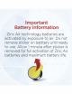 Important Battery Information Zinc Air technology batteries are activated by exposure to air. Do not remove sticker on batttery until ready to use. Allow 1 minute after sticker is removed for full activation of Zinc Air batteries and maximum battery life.