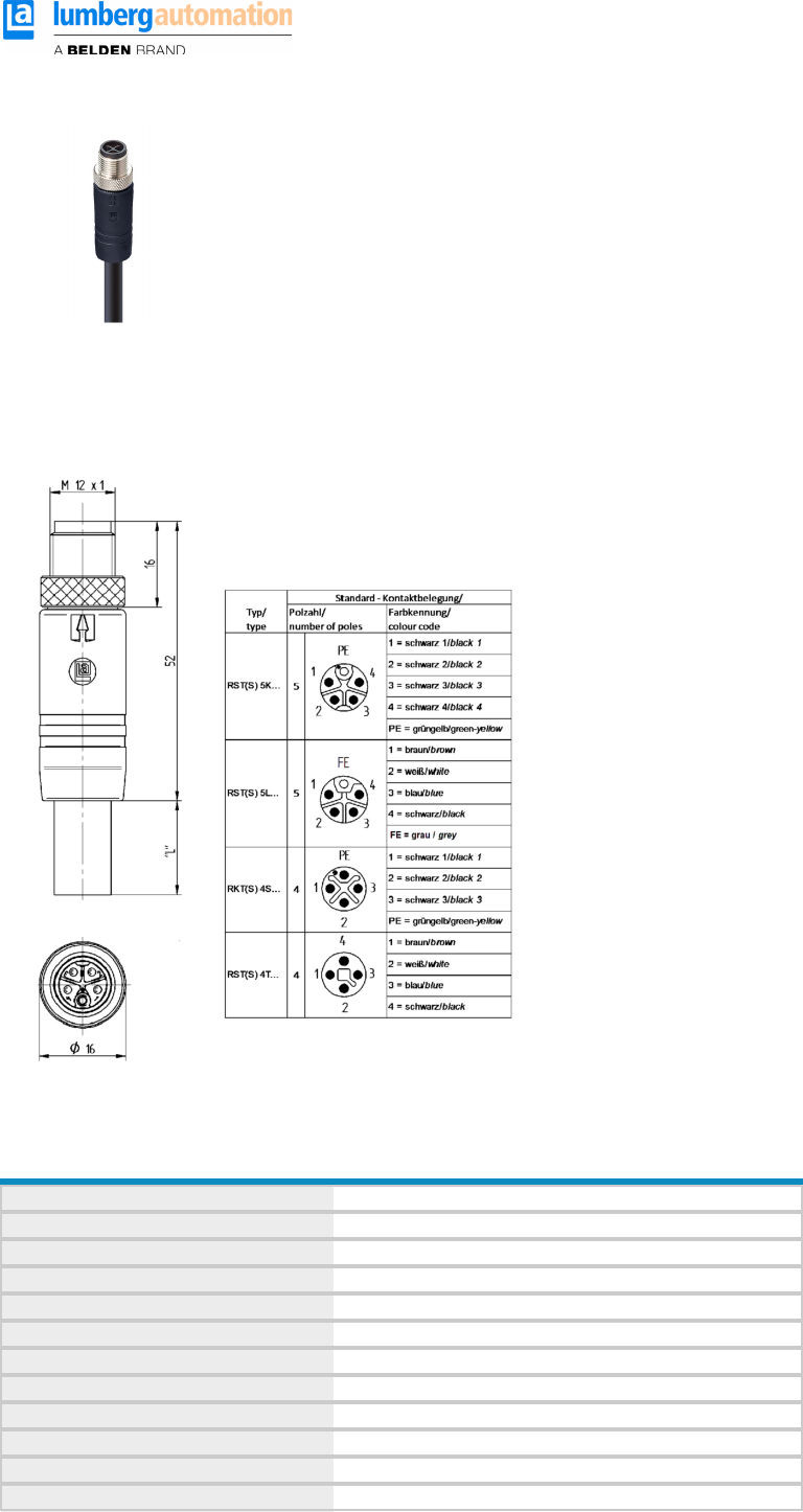M12 Power Single-Ended Cordset: Male, straight, 4-pin(3+PE), S-coded,