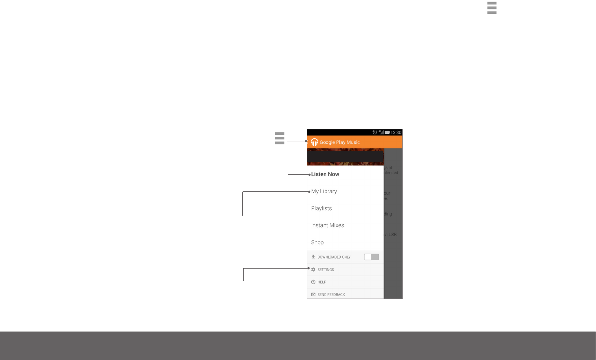 To navigate the Play Music app, you use the Navigation drawer. To open the Navigation drawer, touch the Navigation drawer icon in the