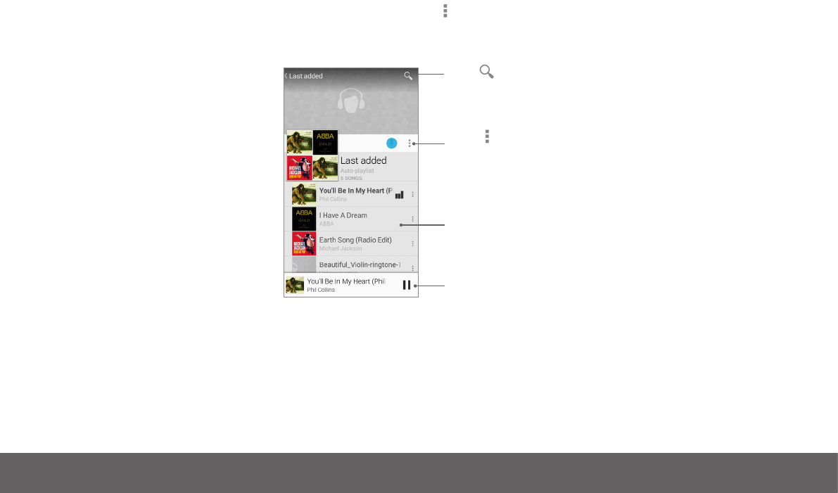 using the “Now playing” bar at the bottom of the screen. Touch the Menu icon next to albums and songs for more options, e.g. play next,