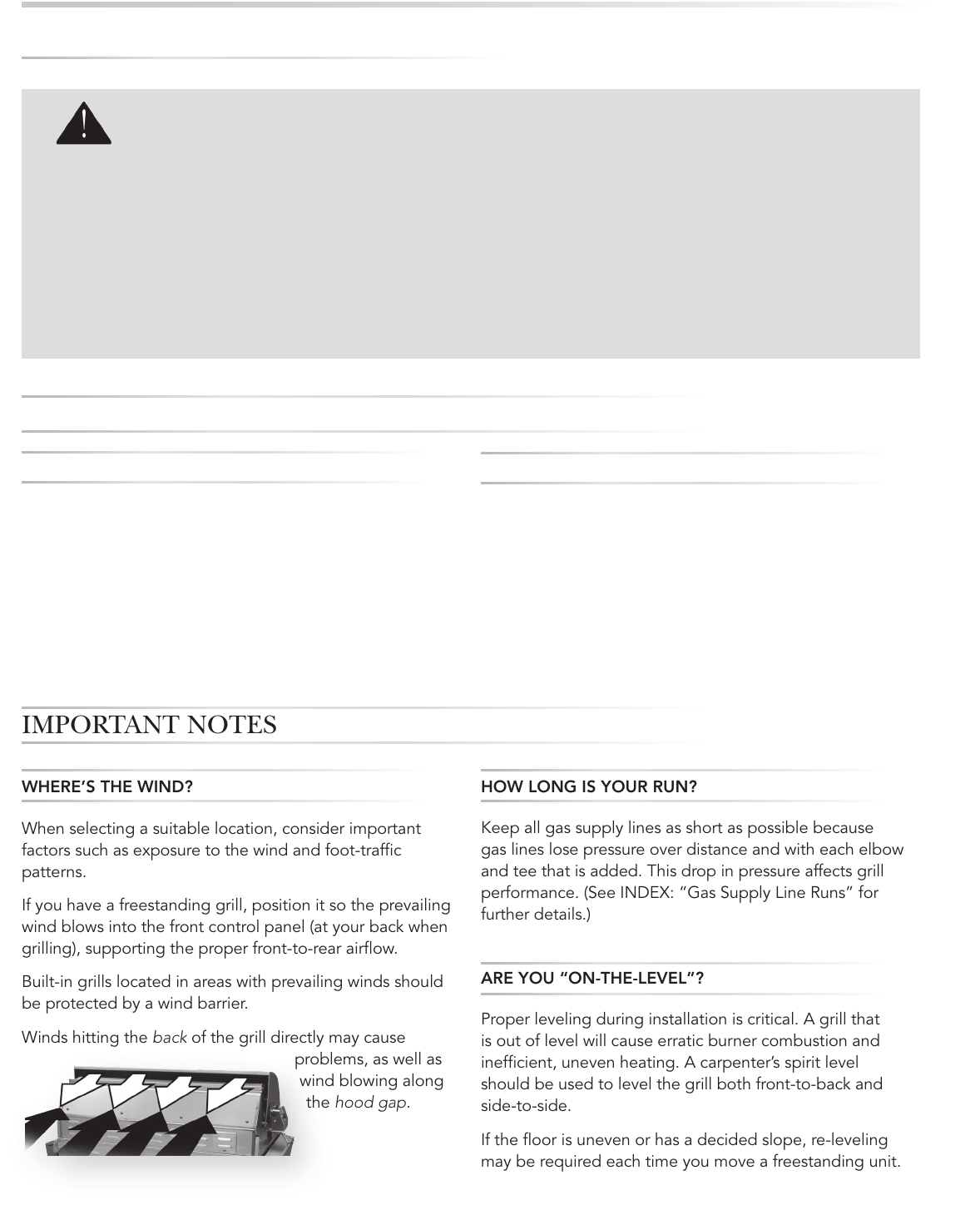 • Never locate the grill under a roof or overhang, in a building, garage, shed or other such enclosed area.