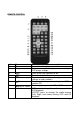 REMOTE CONTROL Item 1 2 Name Power Setup 3 4 5 Mute Eject 0-9 6 7 8 Previous Play or Pause Audio Function or control Press to turn the player on or off. Press to access the setup menu to modify the DVD player settings. Press to turn the sound on or off. Press to eject the disc. Press to enter numbers directly, such as for settings or track numbers. Press to go to the previous chapter on DVD or track on CD. Press to play or pause the CD or DVD.