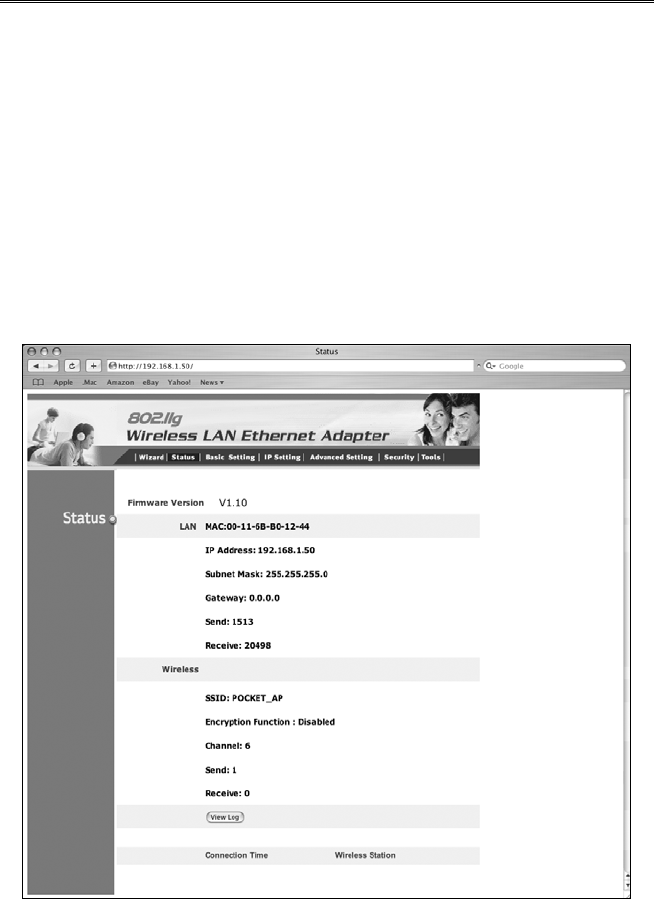 LAN: Shows the MAC Address, IP Address (default: 192.168.1.50), Subnet