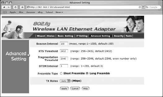 Preamble: Select either a Long or Short Preamble type. The preamble is a