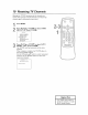 Resetting TV Channels • • Although receive channels the TV/VCR may memorize when you turn it on the first again by following the steps the channels you time, you may set up below. Press MENU. Press PLAY/A or STOP/V to select CHANNEL SET UP. Press F.FWD/_. -MENUTIMER PROGRAMMING PICTURE CONTROL SETTING CLOCK I_ CHANNEL SET UP USER'S SET UP LANGUAGE [ENGLISH] ZERO RETURN TIME SEARCH Press PLAY/A or STOP/V to PRESET. Then, press F.FWD/I_.
