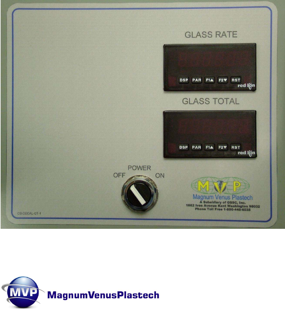 CB-6000-GT Material Monitor Manual MAGNUM VENUS PLASTECH CORPORATE HEADQUARTERS and MANUFACTURING th 11692 56 Court * Clearwater, FL 33760 * Tel 727-573-2955 * Fax 727-571-3636 TECHNOLOGY CENTER and MANUFACTURING 1862 Ives Ave. * Kent, WA 98032 * Tel 253-854-2660 * Fax 253-854-1666 MVP Plastech UK Chilsworthy Beam, Gunnislake, Cornwall, PL18 9AT UK, * Tel: +44 (0) 1822 832621 Fax: +44 (0) 1822 833999 www.mvpind.com Rev.