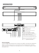 Product Diagram 1 Standby-on: Switch the Soundbar On or to standby. 3 Volume: Decrease the volume. 4 Volume: Increase the volume. 5 6 7 8 9 10 11 12 INPUT: Select an input source for the Soundbar. AC IN: Connect to power supply. 7 HDMI IN 2 : Connect to HDMI OUT of TV/Satellite/ Netework/Set-top box/BD/Blue Ray DVD/DVD player. 8 HDMI IN 1 : Connect to HDMI OUT of TV/Satellite/Netework/ Set-top box/BD/Blue Ray DVD/DVD player. 9 6 DISPLAY PANEL.