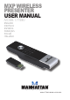 MXP Wireless Presenter • User Manual English Thank you for purchasing the MANHATTAN MXP Wireless Presenter, Model 177580. For a datasheet with specifications, go to www.manhattan-products.com. ® Setup 1. Remove the battery compartment cover and insert the 2 included AAA batteries as indicated (+ and –). Replace the cover. 2. With your computer on, plug the USB receiver into a USB port. The computer will automatically detect the Presenter.