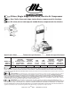 Oilless, Single Stage, Direct Drive, Electric Air Compressor Sans l’huile, d’une seule étape, à prise directe, compresseur d’air électrique Sin aciete, de una sola etapa, de mando directo, compresore de aire eléctrico Specification Chart________Tableau des spécifications_______Cuadro de especificaciones TANK CAPACITY GALLONS VOLTAGE/ AMPS/PHASE (TENSION/ AMPS/PHASE) (VOLTAJE/ AMP/FASE) CFM CFM (L/MIN) @ 40 PSI (2,8 BAR) 115/15/1 8.3 (235) (MODÈLE) (MODELO) H.P.