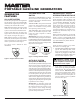 OWNER’S MANUAL ELECTRICAL COMPONENT SPECIFICATIONS Resistance in Ohms Stator Stator Rotor Rotor Capacitor, Main Auxiliary Primary Secondary MFD Winding * Winding ‡ Winding † Winding † 450 Volt Model MGR2900 MGR4500I MGR6000I 1.6 0.835 0.741 5.9 1.852 1.582 6.9 4.91 5.55 1.33 — — Diodes (2) 1000 Volt 16 40 40 6 Amp 8 Amp 8 Amp * Connect T2 (green) and T3 (black). Measure resistance between T1 (red) and T4 (yellow). ‡ Resistance between brown and white leads. † Remove diodes to check resistance.