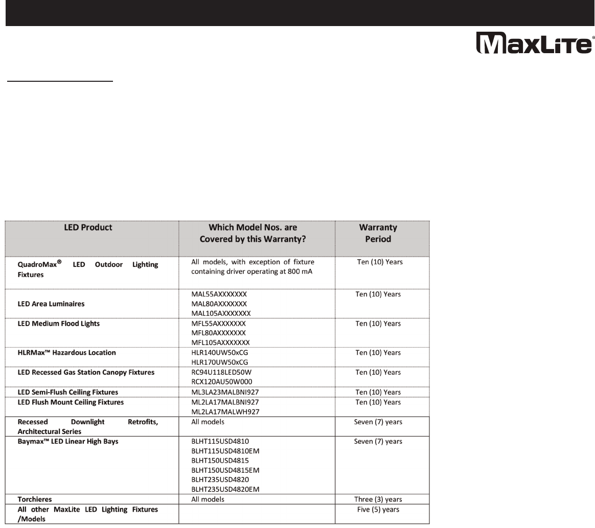 MaxLite warrants that each of its LED lighting fixtures (the “Product(s)”) that are purchased while this Warranty is in effect will be free