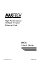 HX-5 User’s Guide Section 1 - Introduction The MaxTech HX-5 is a 5-port ethernet hub compliant with the IEEE 802.3 10Base-T standard. The five RJ-45 ports connect workstations or other devices together on a 10Base-T network using unshielded twisted-pair cable. An additional crossover port connects this hub to a second hub using standard UTP cable for easy network expansion. A full set of LED indicators assist in network troubleshooting.