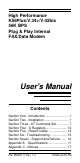High Performance K56Plus/V.34+/V.42bis 56K BPS Plug & Play Internal FAX/Data Modem User's Manual Contents Section One - Introduction .......................... 1 Section Two - Installation ............................ 1 Section Three - AT Command Set .............. 7 Section Four - S Registers ........................ 12 Section Five - Result Codes ..................... 14 Section Six - Troubleshooting ................... 15 Section Seven - Support and Service ....... 16 Appendix A - Specifications .......