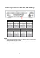 Video Signal Select & RS-422/485 Settings Video mode NTSC Video output PAL BNC RS-422/485 Select 485 VGA RS-485 Termination 422 ON OFF NOTICE 1. Do not change the setting when the power is on. When the switch is changed, the DVR should be rebooted to apply the new setting. 2. RS-485 Termination ON/OFF function is available on specific hardware version of the system. Please inquiry the manufacturer.