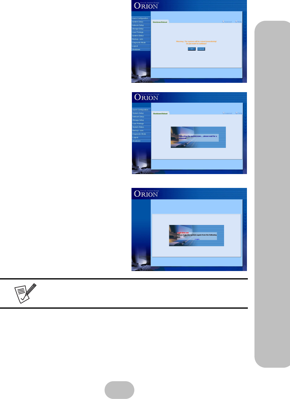 - Use this function to shutdown the Orion 410ST NAS System properly.