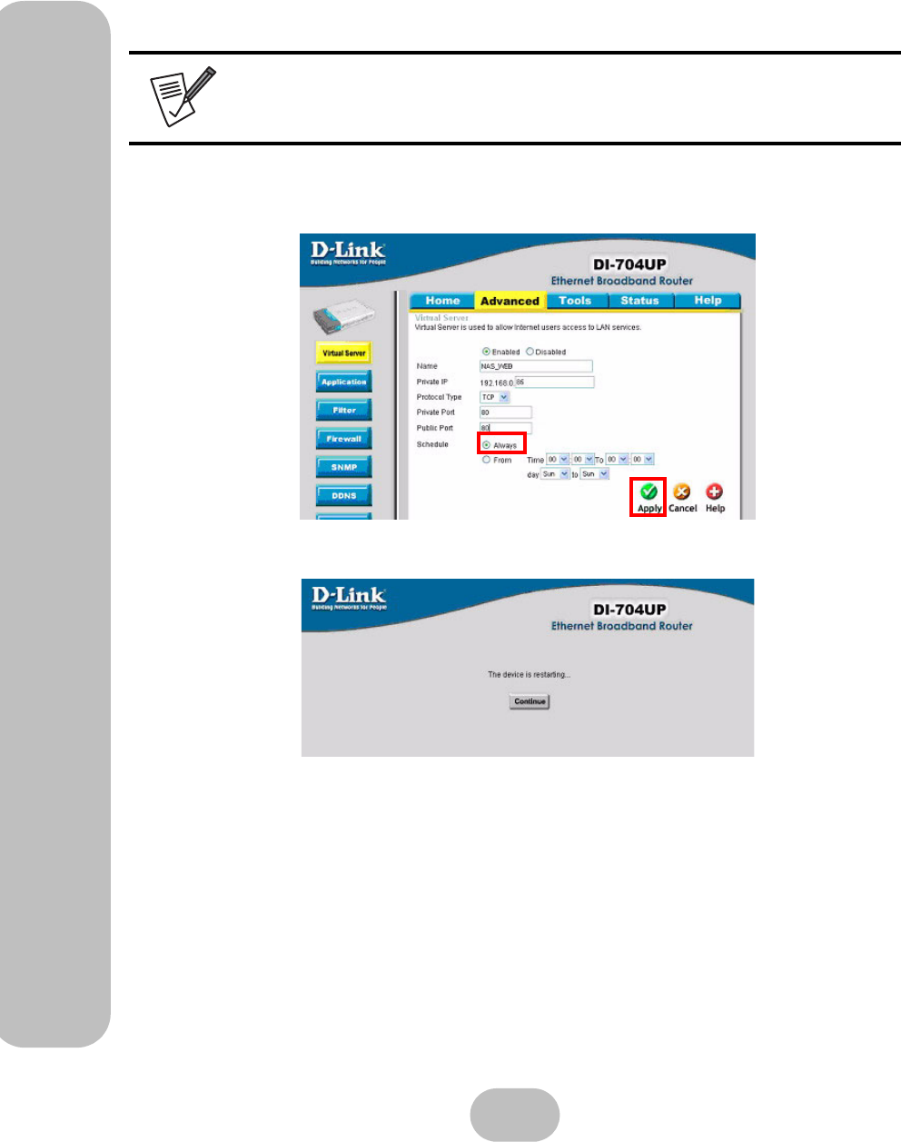 1 Enter 80 in the‘Private port/Public port’ field (the standard WEB port number).