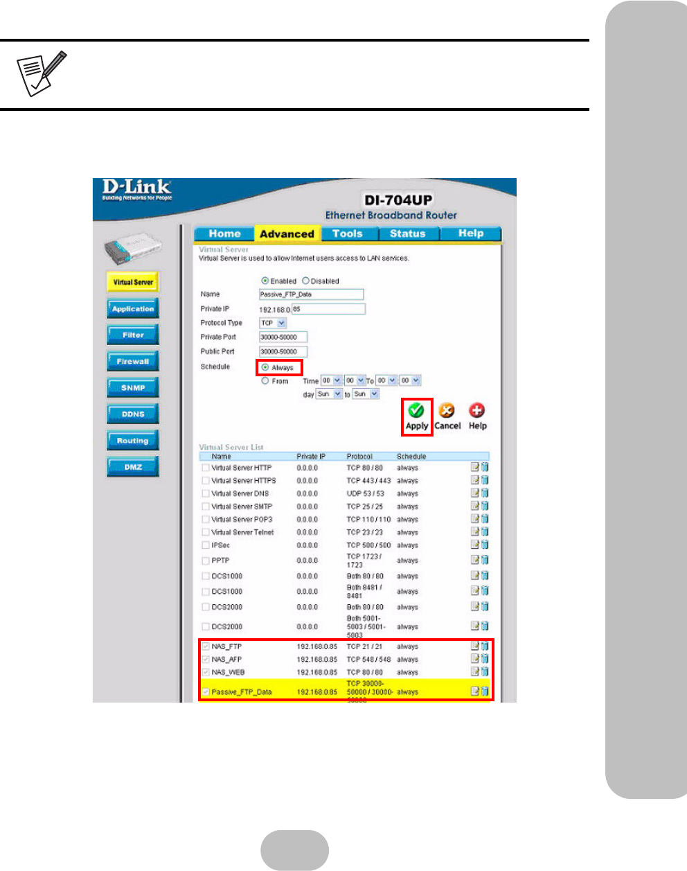 1 Enter the passive port range (30000-50000) in the‘Private port/Public port’ field.