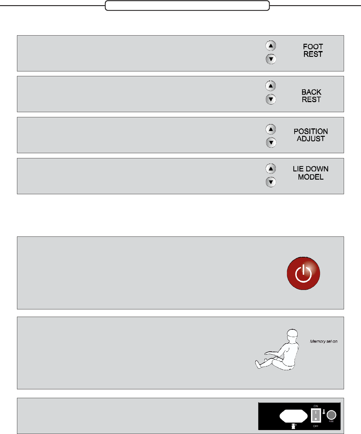 Der Aufwärts-Pfeil stellt die Rückenlehne auf und senk die Fußrasten ab