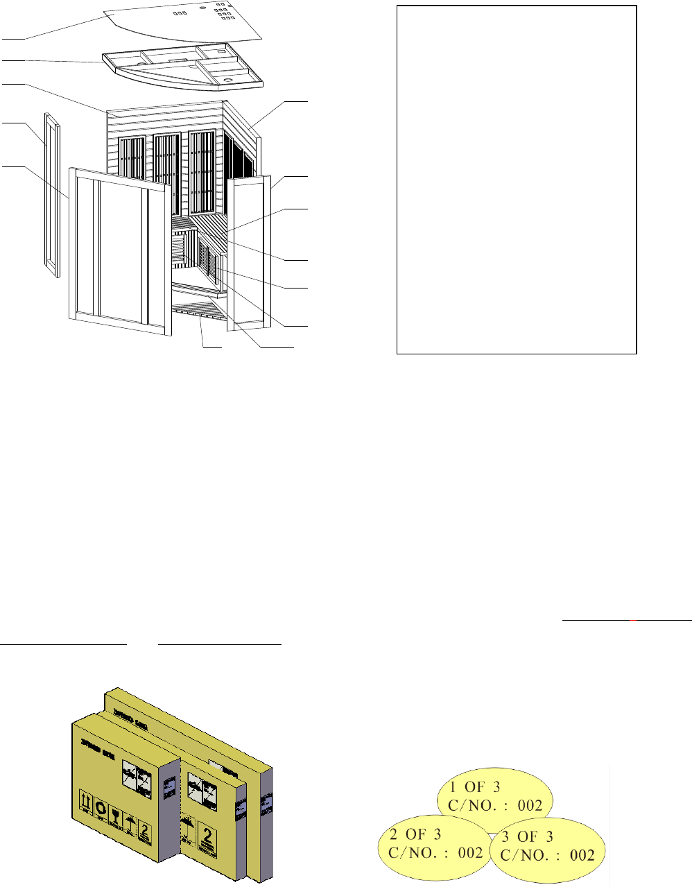 3. 3-person sauna and 4-person sauna models are packed in three cartons. For example: C/NO: 002 1 OF 3,