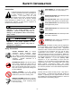 SAFETY INFORMATION Introduction SAFE DRESS: Do not wear loose clothing, rings, wristwatches, etc. near machinery. This Safety Alert Symbol is used to call attention to items or operations which may be dangerous to those operating or working with this equipment. The symbol can be found throughout this manual and on the unit. Please read these warnings and cautions, along with all decals, carefully before attempting to operate the unit.