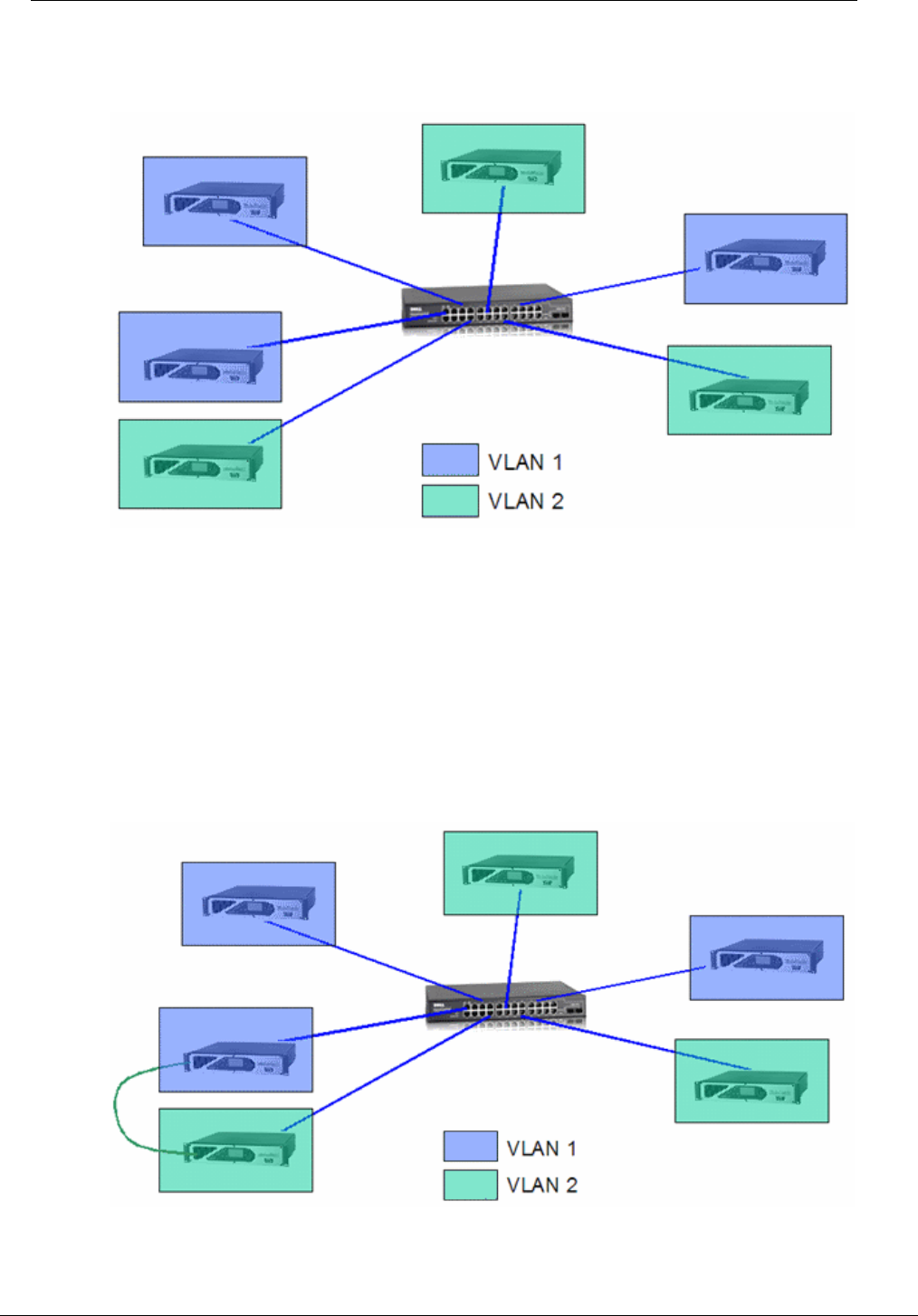 In this scenario, VLANs are configured using the port based VLAN capability of a managed