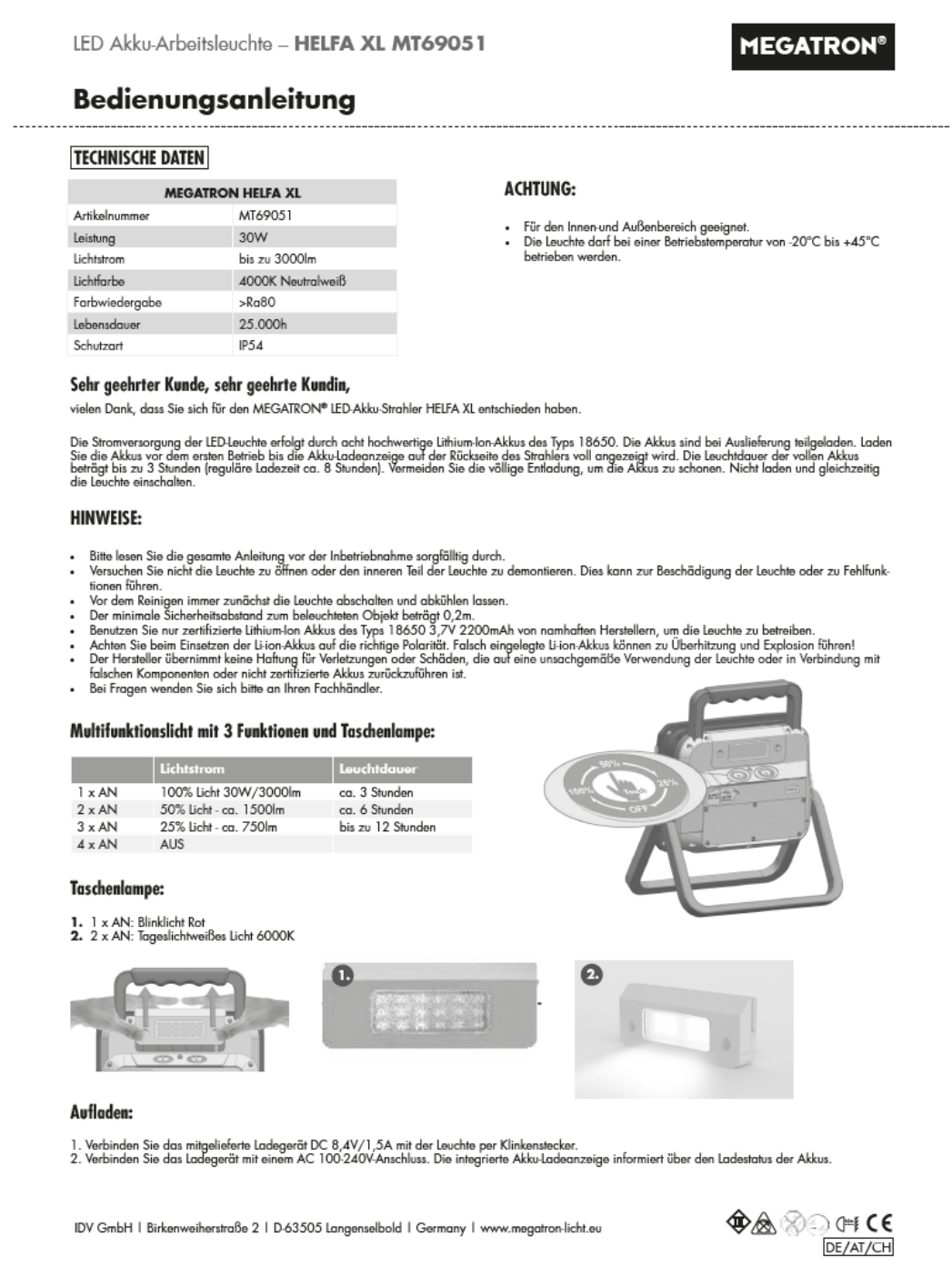 Megatron MT69051 Helfa XL LED (monochrome) Work light rechargeable 30 W 3000 lm