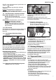 ENGLISH en 7.9 On/Off switch, setting the speed Switching on, speed: press the trigger (13). The rotational speed can be changed at the trigger switch by pressing. Switching off: Release the trigger (13). Note: The noise that the machine makes when it switches off is due to the design (quick stop) and has no influence on the function or the service life of the machine. 7.10 LED lights For working on dimly lit areas. The LED lights (12) light up when the machine is switched on. 7.