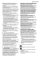 РУССКИЙ ru • Держите вентиляционные отверстия свободными от посторонних предметов. • Не пользуйтесь электроинструментом в состоянии усталости, под воздействием наркотиков, алкоголя или медикаментов. Даже секунда невнимательности при работе с электроинструментом может привести к серьезным травмам. • Всегда используйте входящий в комплект поставки ремень для переноски / плечевой ремень. • Сохраняйте правильную осанку. Всегда занимайте устойчивое положение и сохраняйте равновесие, особенно на склонах.