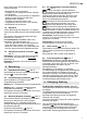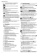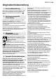 SUOMI fi 7.9 Akun irrotus, asennus Kuva A Irrottaminen: Paina akun lukituksen vapautuspainiketta (13) ja vedä akku (14) ylöspäin irti. Asentaminen:Työnnä akku (14) paikalleen, niin että napsahtaa kiinni. 8. Käyttö Kuva A 8.1 Purunpuhallin Kytke kytkentänupista (8) kääntämällä päälle (symboli ) tai pois päältä. 8.2 Heiluriliikkeen säätäminen Kuva A Säädä säätövivusta (7) haluamasi heiluriliike. Asento "0" = heiluriliike on kytketty pois toiminnasta ...