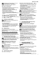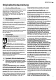 ru РУССКИЙ 4.7 Дополнительные указания по технике безопасности: ПРЕДУПРЕЖДЕНИЕ! Всегда носите защитные очки. При необходимости используйте эластичные прокладки, если они поставляются вместе с инструментом. Соблюдайте указания производителей рабочих инструментов или принадлежностей! Берегите круги от ударов и контакта с жирами и смазками! Бережно храните и применяйте абразивные круги в соответствии с предписаниями производителя.