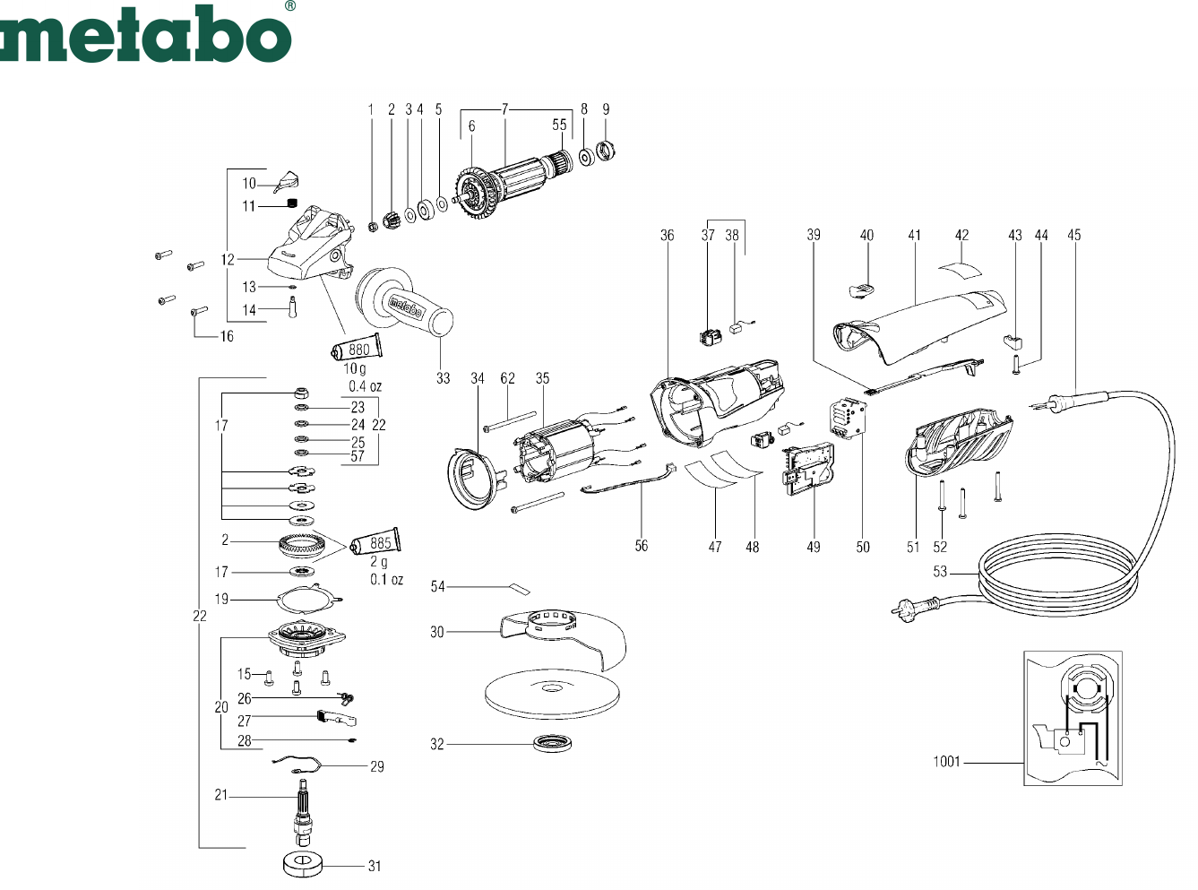 WEA 14-150 Plus Позиция 43 44 45 47 48 49 50 51 52 53 55 56 57 62 880 885 1001 Количество 1 1 1 1 1 1 1 1 3 1 1 1 1 2 1 1 1 Номер для заказа 343362490 141116020 344100970 338050670 399999990 343081050 343409450 343395630 141123490 344497150 343399850 343081140 141153920 141118270 344130920 344130560 338504700 Описание Cable clip Self-tap fill h screw Cable sleeve Rating plate Part not needed Electronic unit,230V 50-60Hz Switch Housing black Fillister head screw Cable with plug Tacho disc Temperature sens