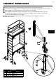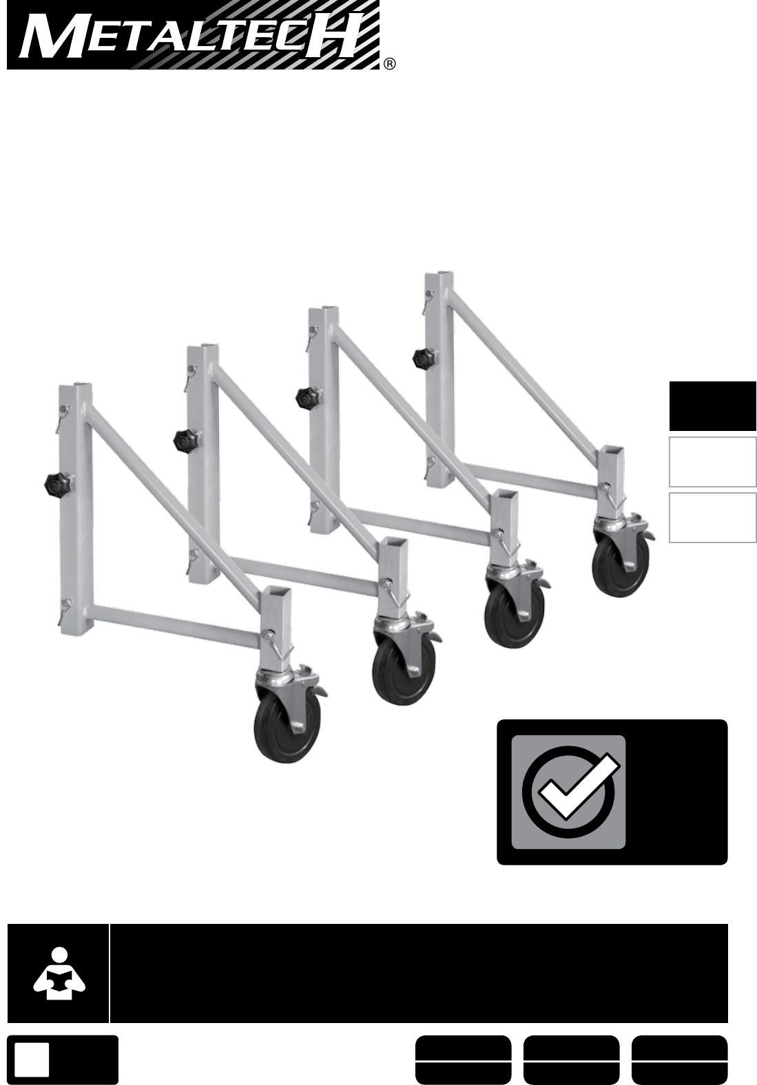 INSTRUCTIONS DE MONTAGE 1 Ériger l’échafaudage (d’une à deux unités de haut) selon les directives du fabricant. 2 Installer une roue dans un stabilisateur et la fixer à l’aide de la tige de verrouillage. Apposer le frein. Répéter l’opération avec les autres roues. 3 Placez le stabilisateur à 90° sur le cadre latéral de l’échafaudage. 4 Fixer le stabilisateur en place à l’aide de deux tiges de verrouillage.