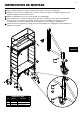 INSTRUCCIONES DE MONTAJE 1 Erija el andamio (de una o dos unidades de altura) según la directivas del fabricante. 2 Instale la rueda en el estabilizador y asegúrela con el cierre a pestillo. Ponga el freno. Repita la operación con las otras ruedas. 3 Ponga el estabilizador en un ángulo de 90º sobre el cuadro lateral. 4 Cierre el estabilizador en su sitio con los dos pestillos de blocaje.