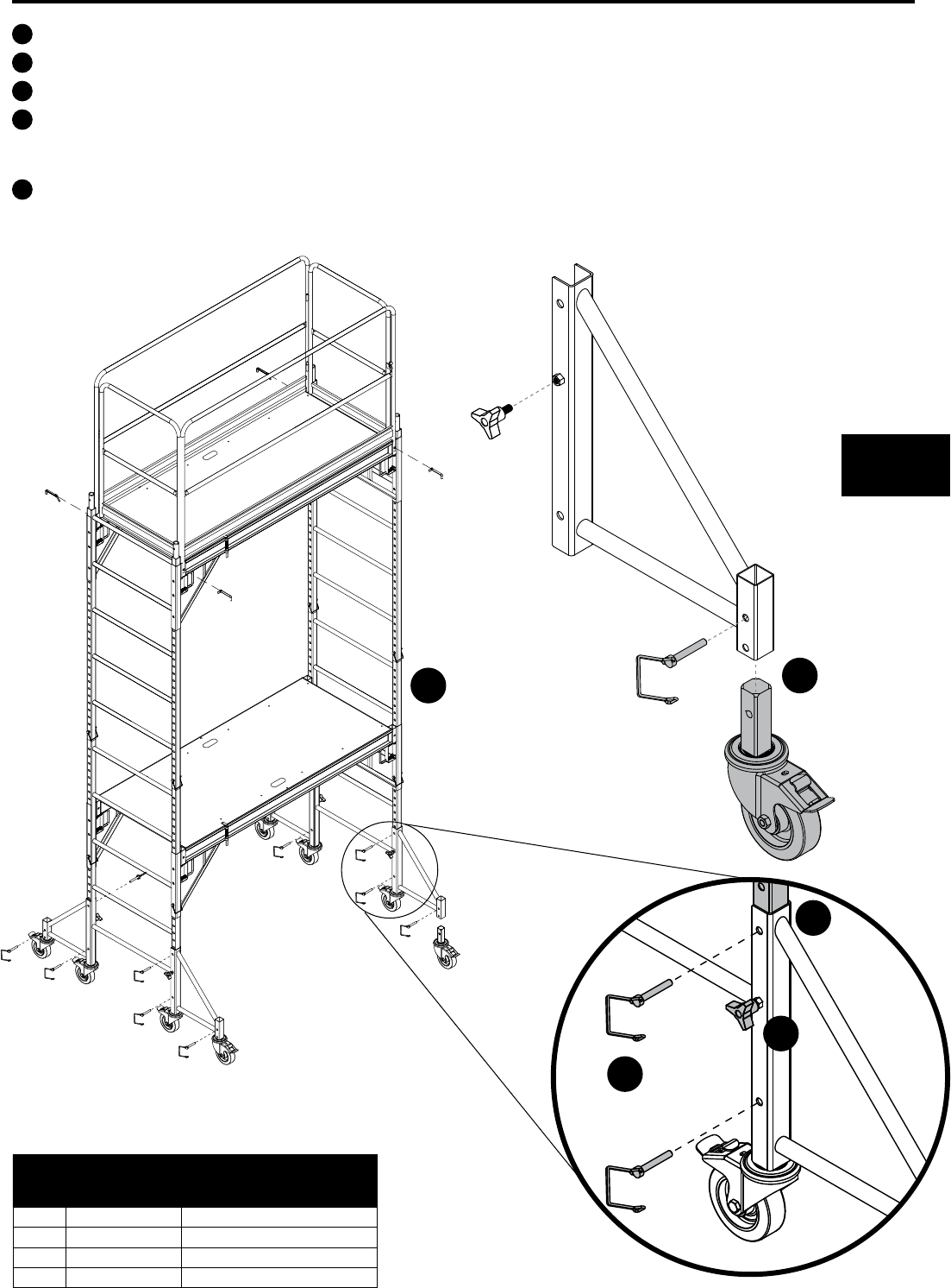 Lock outrigger into place by using two locking pins. If you use scaffolding with casters, you must