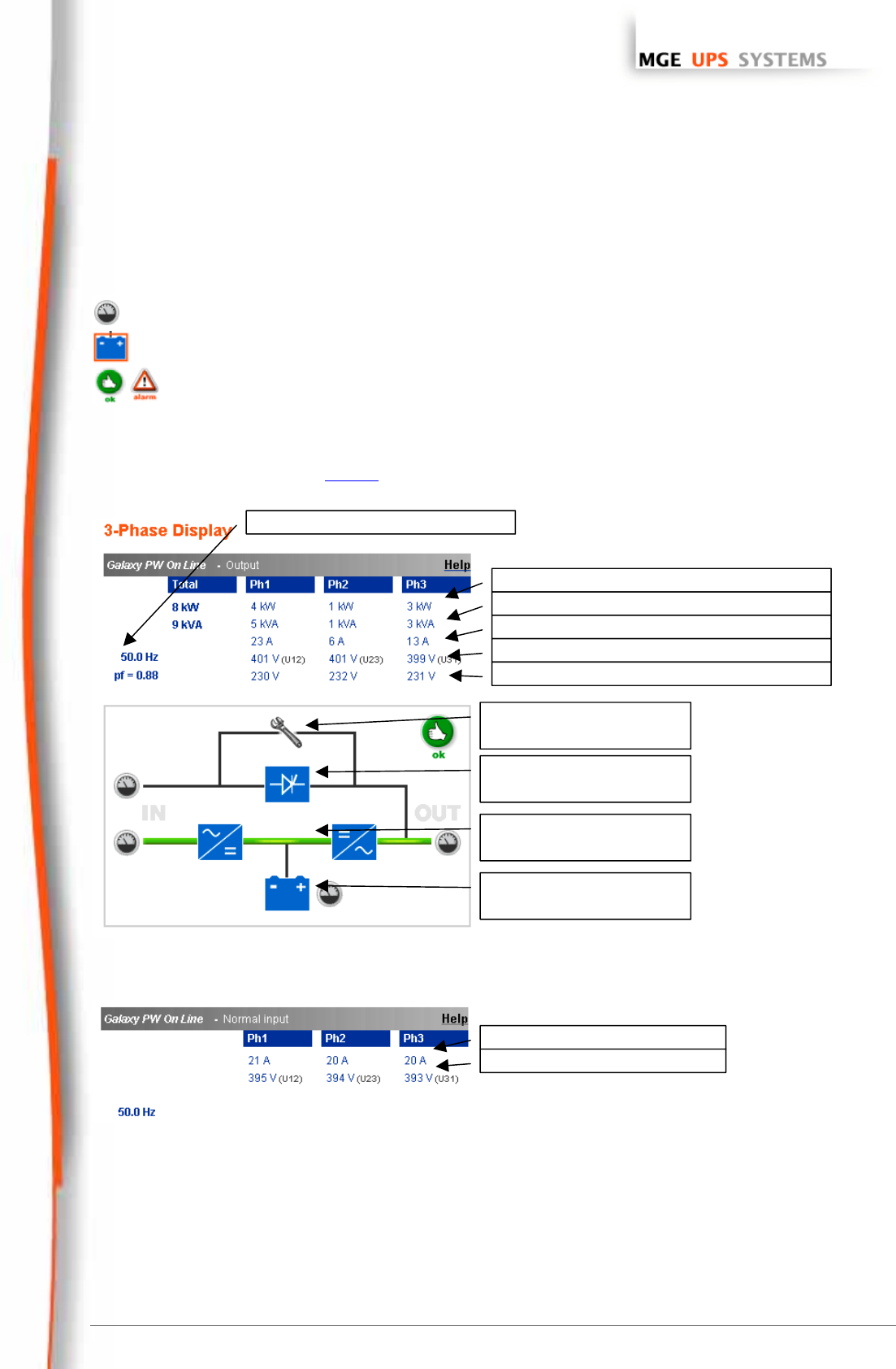The red triangle, linked to the alarm page, appears when an alarm is present, otherwise a green