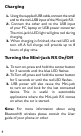 Charging 1. Using the supplied USB cable, connect the small end to the mini-USB input of the Mini-jack RX. 2. Connect the other end to the USB input of your PC, laptop or USB power converter. The mini-jack’s LED light will glow red during charging. 3. When charging is finished, the red LED will turn off. A full charge will provide up to 8 hours of play time. Turning the Mini-jack RX On/Off 1. To turn on, press and hold the center button for 3 seconds until the blue LED flashes. 2.