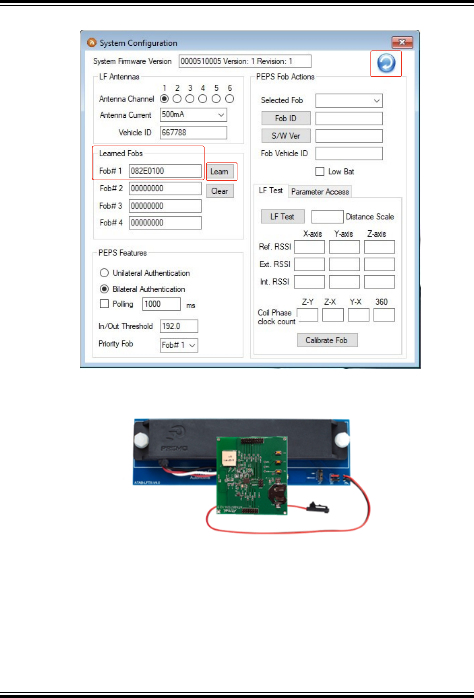 3. Place the ATAB5702A fob board in close proximity (<10 cm) to the LF antenna module, as shown in the