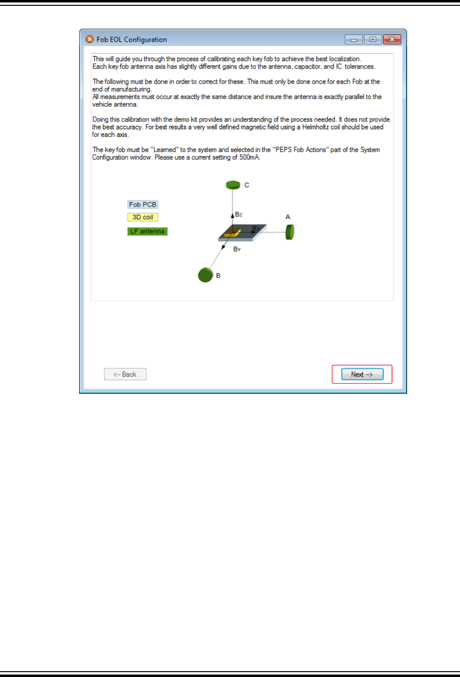 5. Position the LF antenna module and the fob (as shown in the following figure) to align the X-axis of the fob