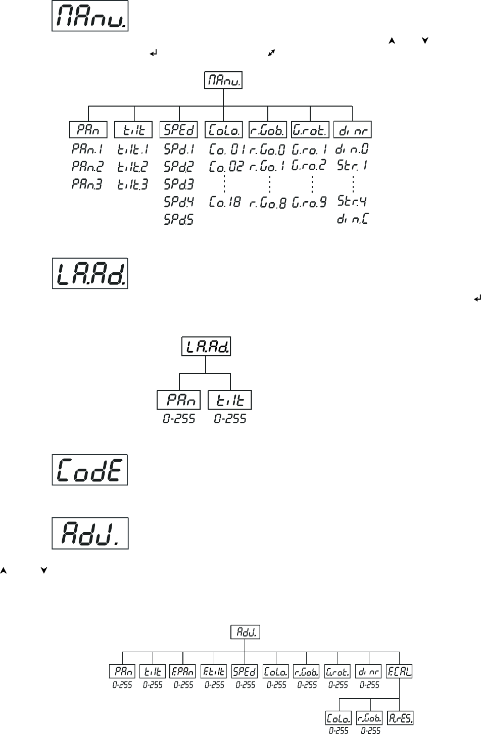 "PAn, tilt,FPAn,FTilt,SPEd,Colo,rGob,Grot, dimr, FCAL" by which you can adjust the fixture to the required/