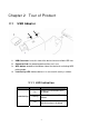 Chapter 2 Tour of Product 2.1 USB Adapter 1. USB Connector: insert this side of the device into an available USB slot. 2. Connector Cab: for protecting device when not in use. 3. WPS button: located on the bottom side of the device for activating WPS pairing mode. 4. Link/Activity LED: indicate device is in use or traffic activity is evident. 2.1.