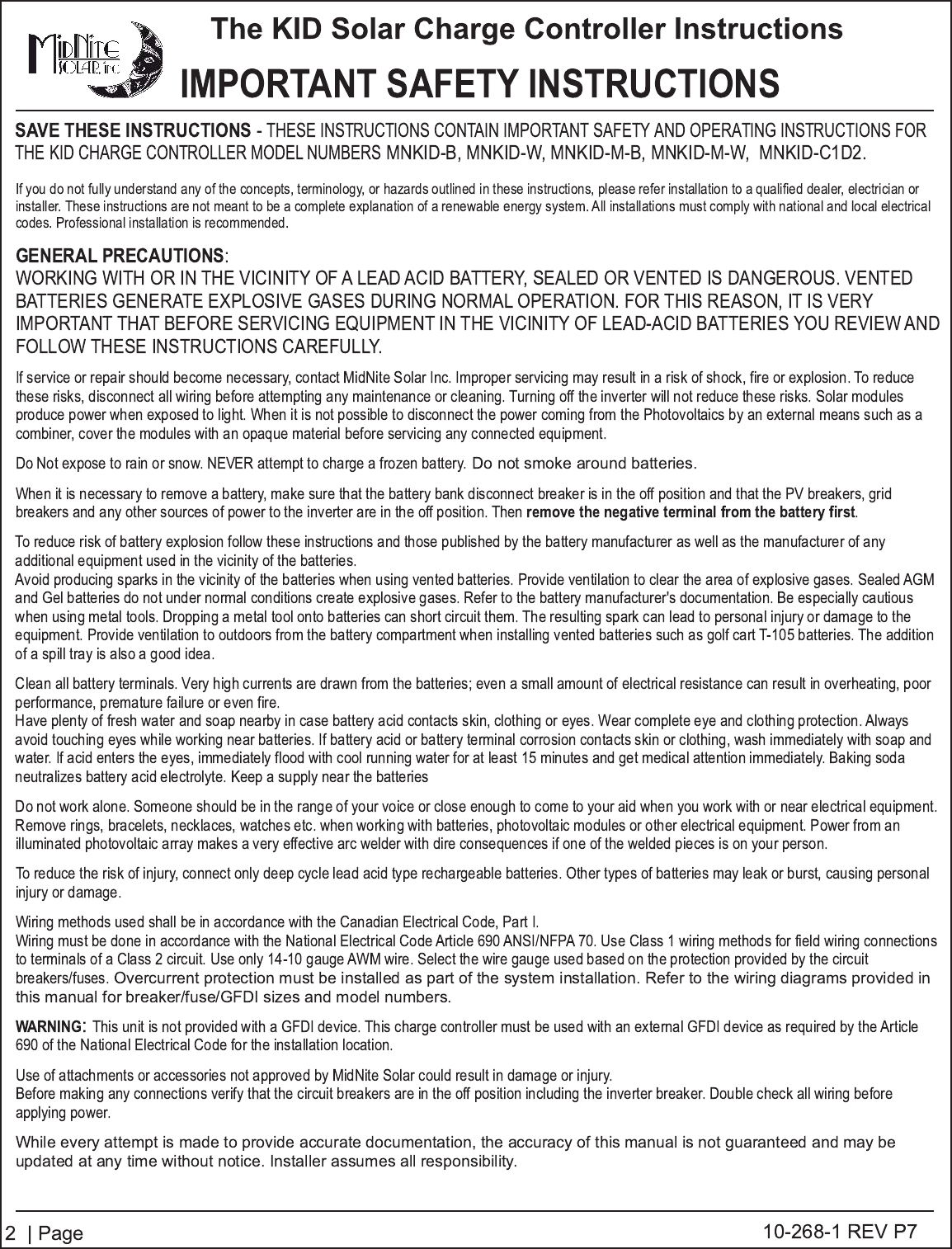 If service or repair should become necessary, contact MidNite Solar Inc. Improper servicing may result in a risk of shock, fire or explosion. To reduce