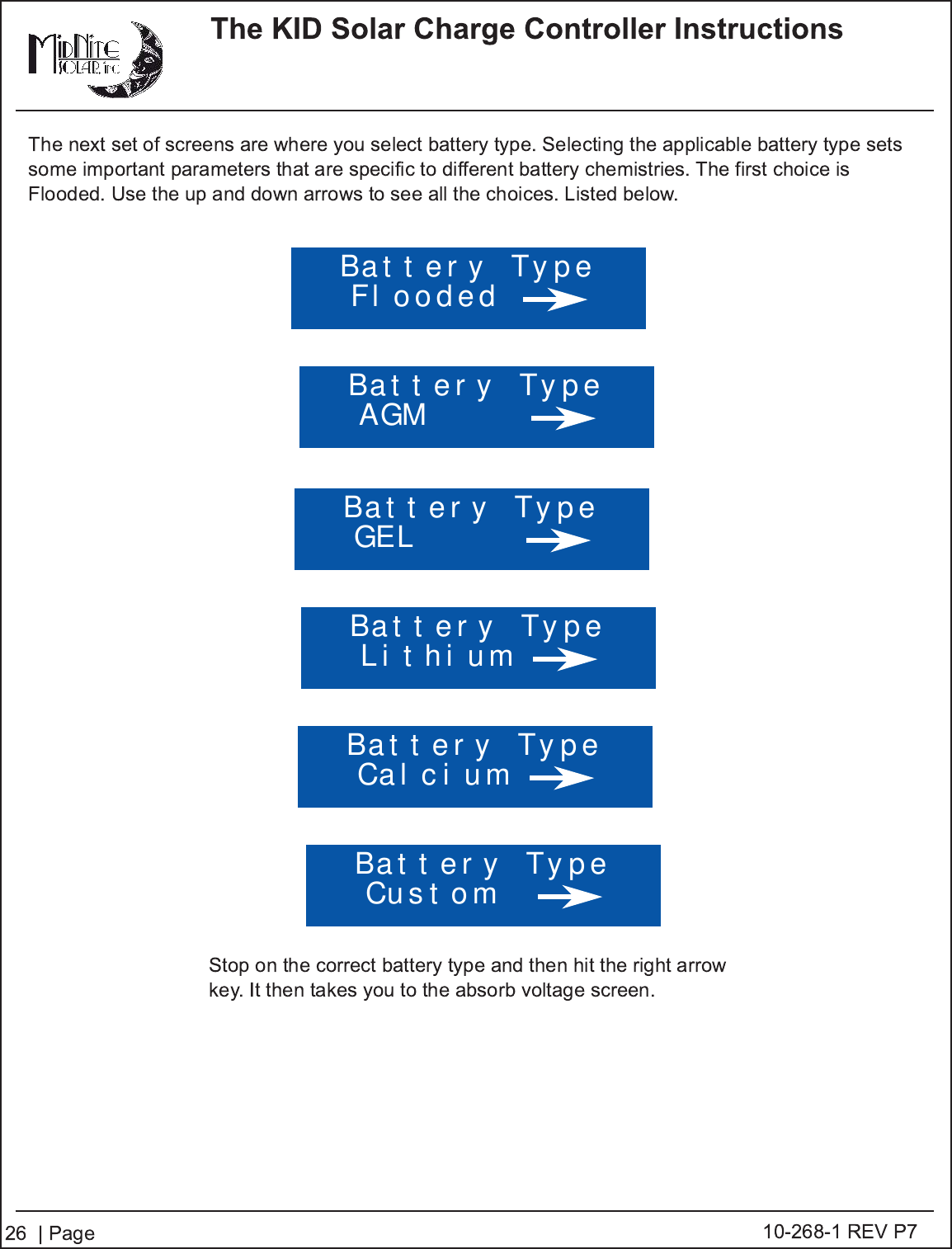 The next set of screens are where you select battery type. Selecting the applicable battery type sets