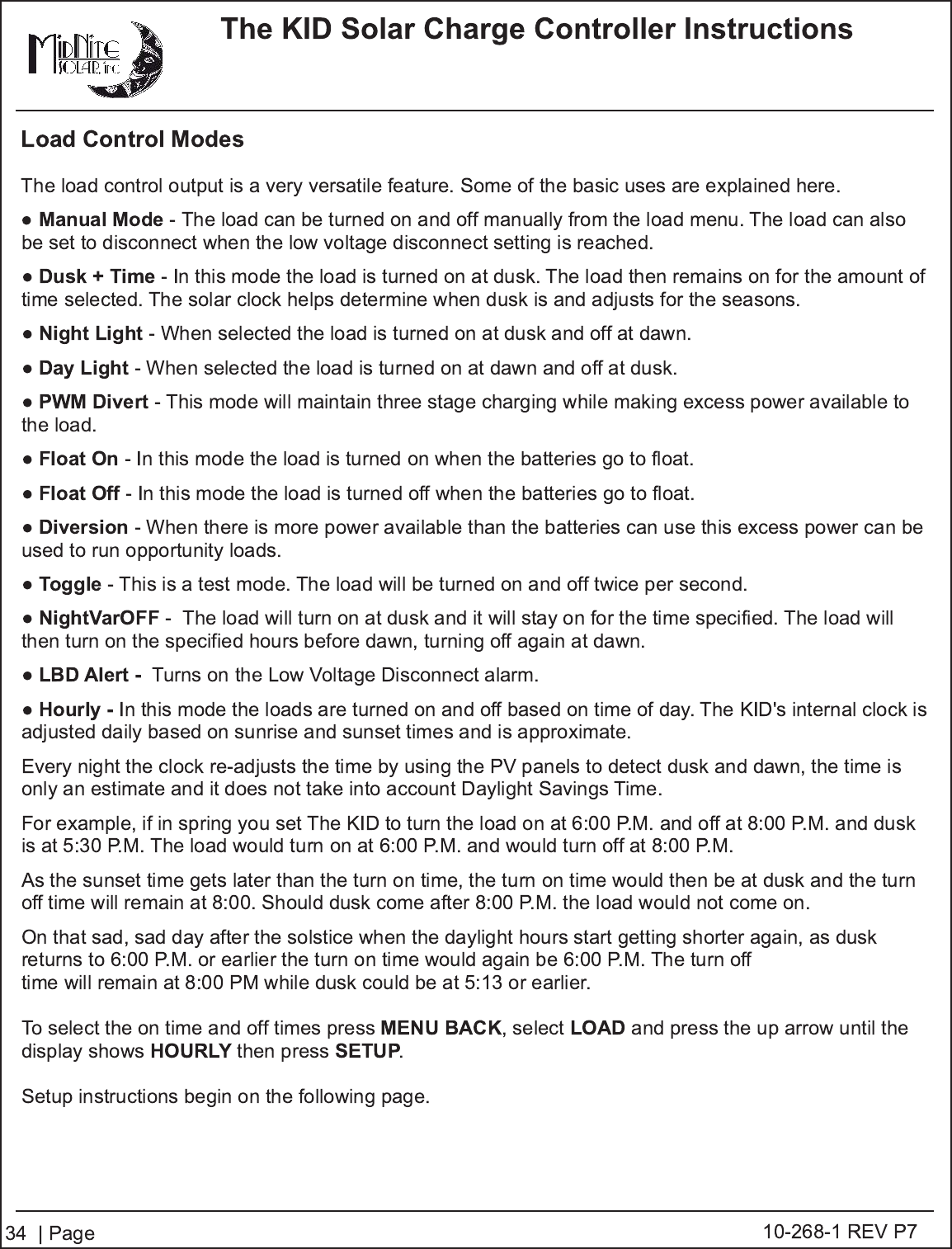 In this mode the loads are turned on and off based on time of day. The KID's internal clock is