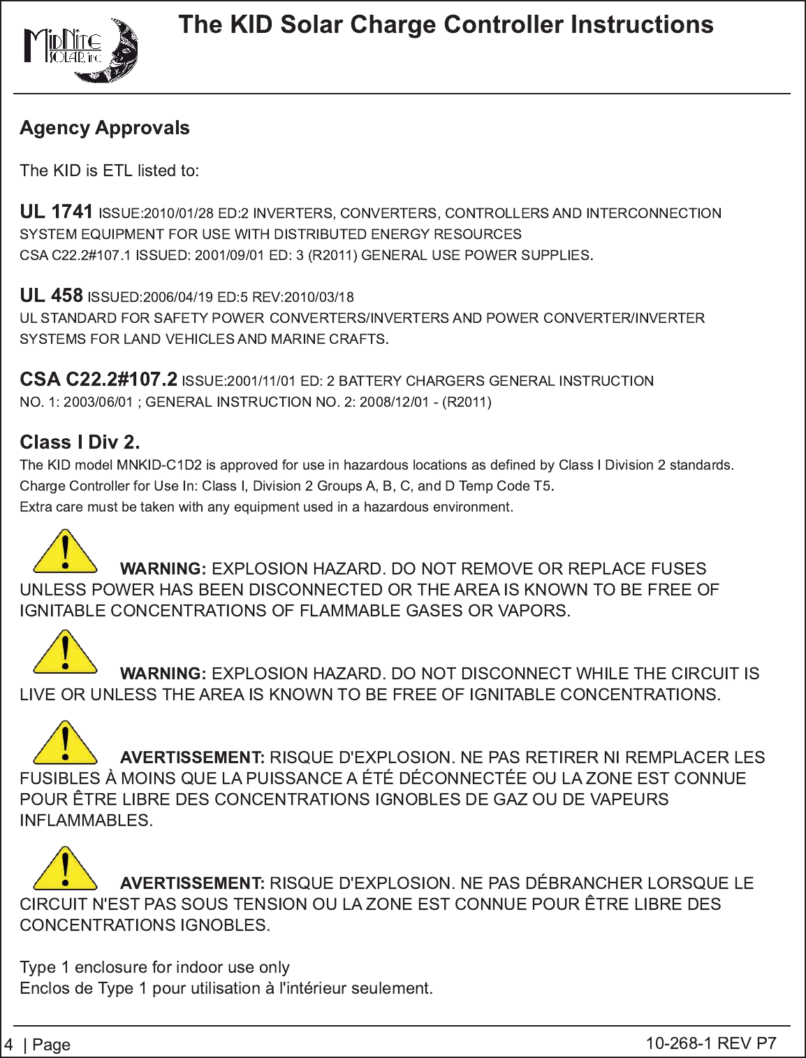 Charge Controller for Use In: Class I, Division 2 Groups A, B, C, and D Temp Code T5.