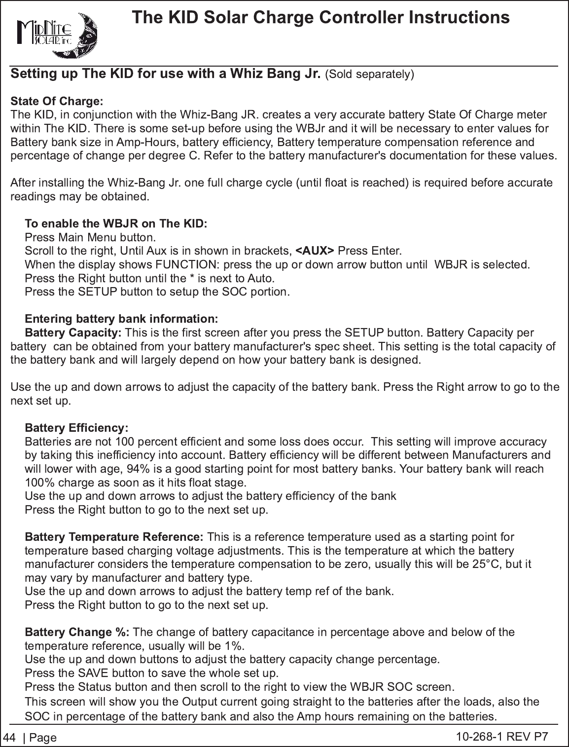 After installing the Whiz-Bang Jr. one full charge cycle (until float is reached) is required before accurate
