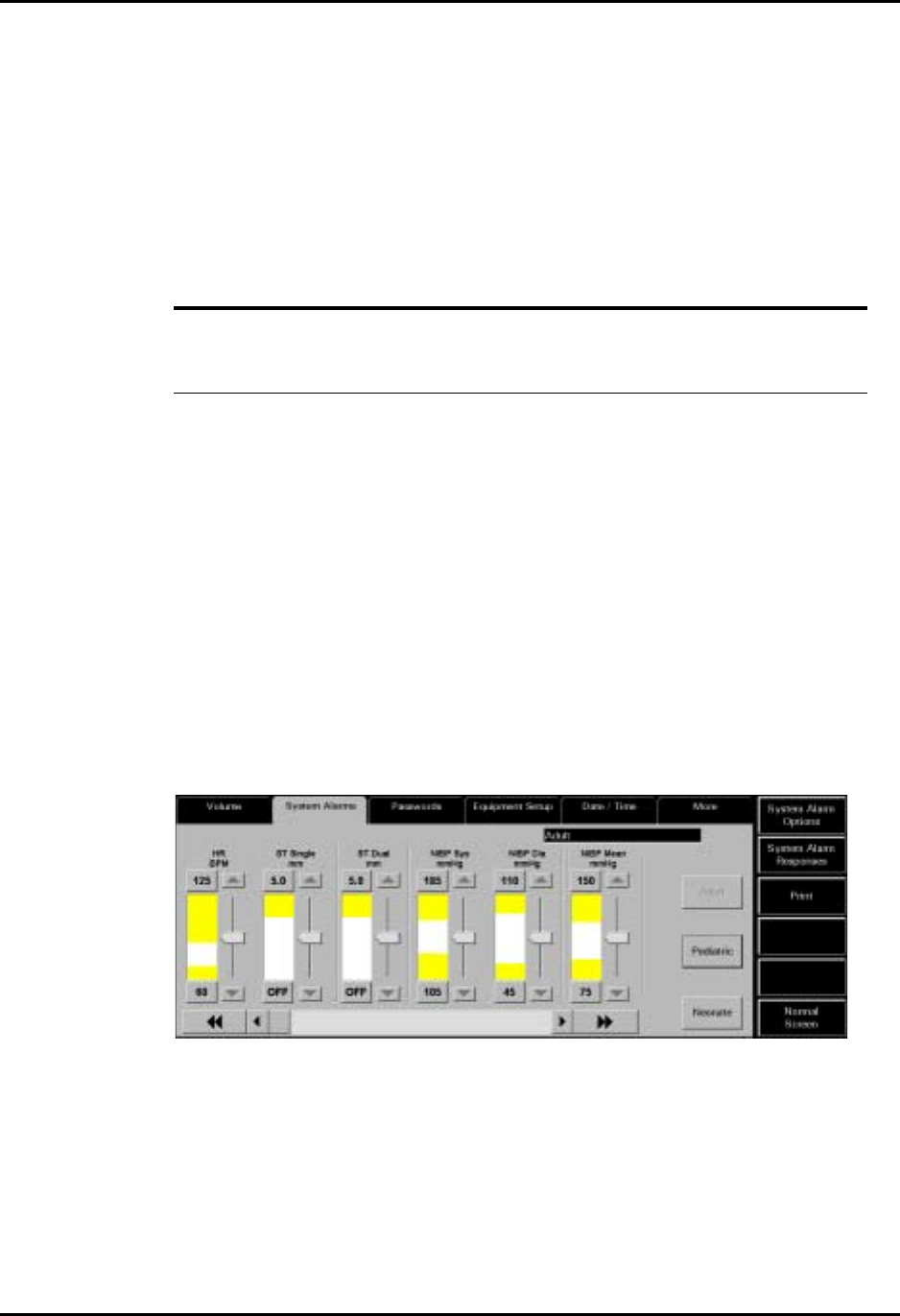 The System Alarms (Alarm Limits) tab (FIGURE 9-6) controls the system default settings for
