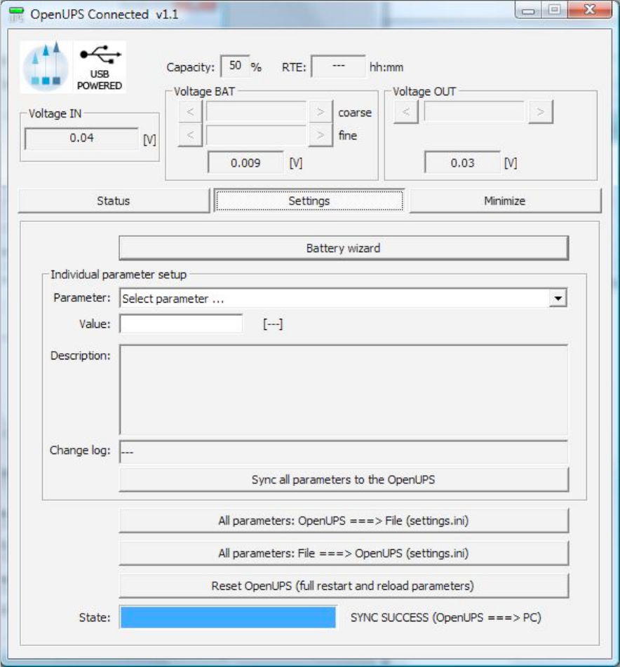 either by the "Reset OpenUPS" button. Do this with precaution, check the parameters and
