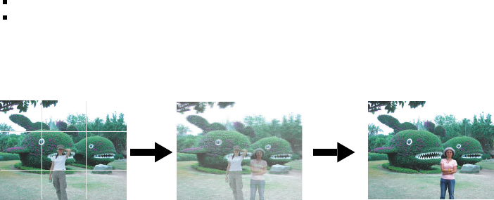 1. You compose the background you want and press the shutter button, which causes a semi-transparent