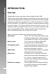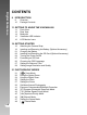Digital Camera >> CONTENTS 8 INTRODUCTION 8 10 Overview Package Contents 11 GETTING TO KNOW THE VIVICAM 4000 11 12 14 15 16 Front View Rear View Mode dial Viewfinder LED Indicator LCD Monitor Icons 19 GETTING STARTED 19 19 21 23 24 25 26 27 28 Attaching the Camera Strap Inserting and Removing the Battery (Optional Accessory) Charging the Battery Inserting and Removing the SD Card (Optional Accessory) Turning the Power On/Off Formatting an SD Card Choosing the OSD Language Setting the Date and Time Se