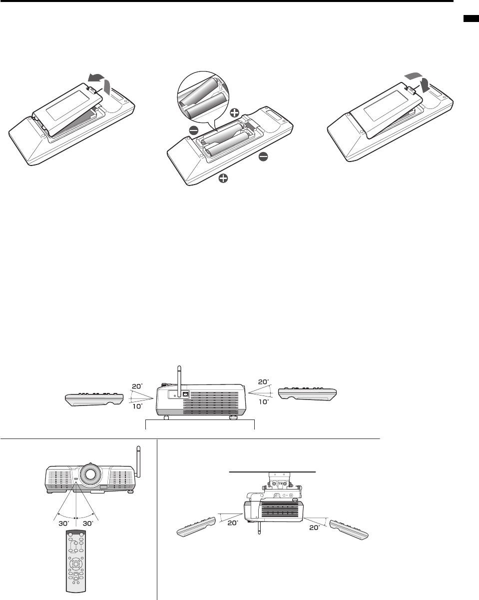 • Load the battery with its positive (+) and negative (-) sides correctly oriented as indicated on the remote control.